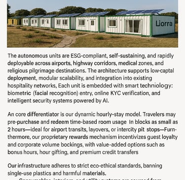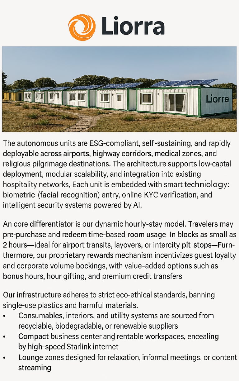 Liorra Motel is not just a lodging option; it is a solution that redefines the way we think about hospitality. By combining sustainability with advanced technology and flexible rental options, we are paving the way for a new standard in the industry. The right solution at the right time, Liorra Motel embodies the future of micro-hospitality, providing an exceptional experience while prioritizing the planet.